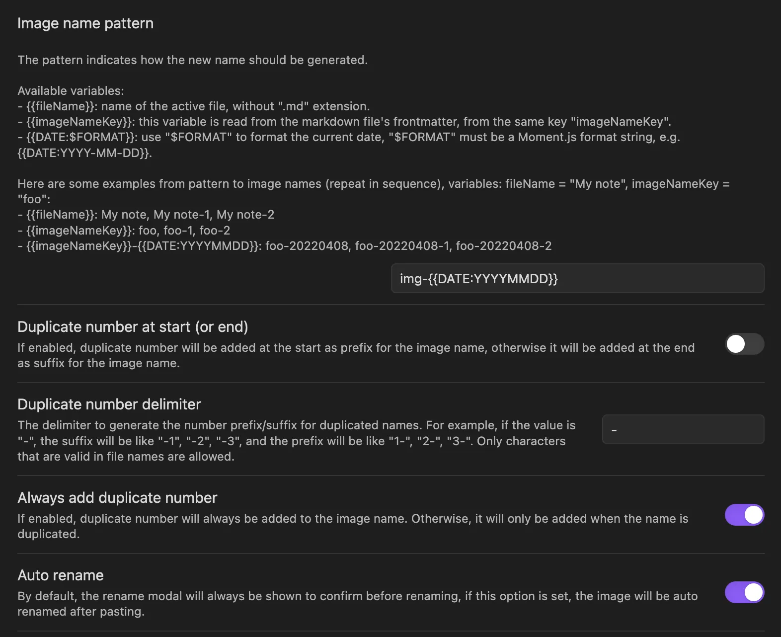 markdown 글 작성을 편하게 하기 위해서 Obsidian 을 사용중인데, 첨부파일을 붙여넣기 할 때, 저장하는 파일의 파일명이 너무 길고, space 가 들어가서 간결하게 바꾸려고 함.