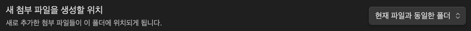 참고로, 첨부파일 저장 위치는 설정 > 파일 및 링크 > ‘새 첨부 파일을 생성할 위치’ 항목을 ‘현재 파일과 동일한 폴더’로 설정해서 사용중