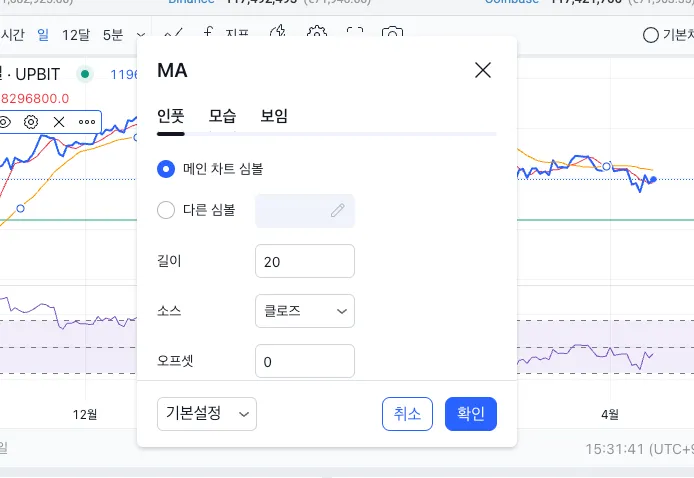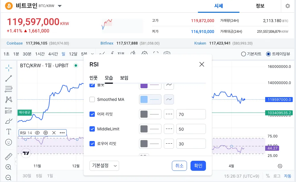 차트에서 RSI 지표를 추가하고, 어퍼와 로우어를 70 ~ 30으로 설정해서 보조지표로 활용 가능