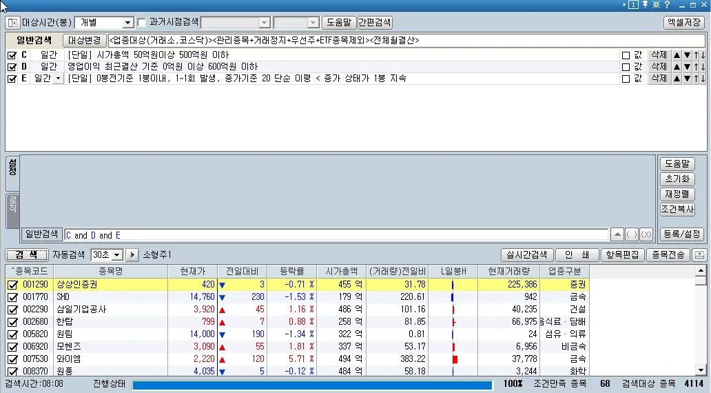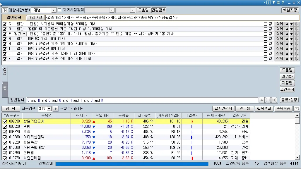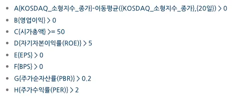 - [0110] 사용자 조건검색을 이용해서 위 조건 만족하는 소형주 검색기 설정